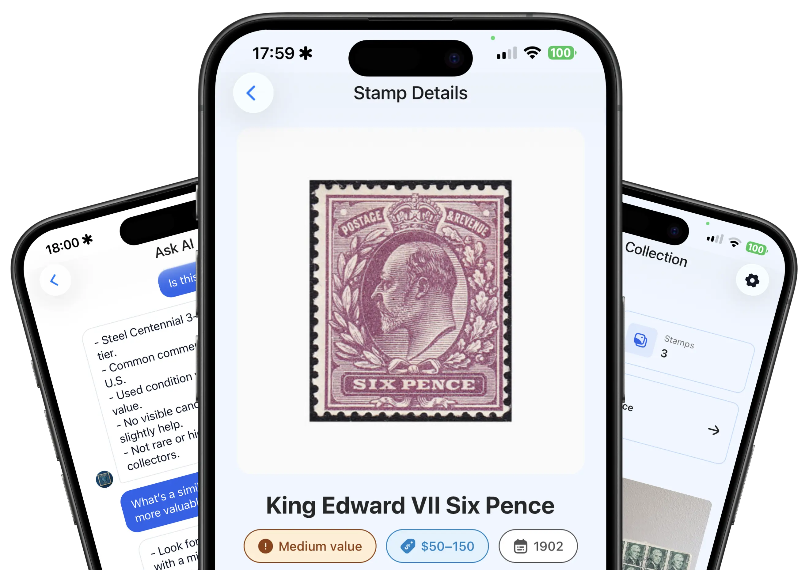 Take or upload a photo and get likely stamp, traits, and value notes—fast. 2 free scans/day; unlimited with Premium.